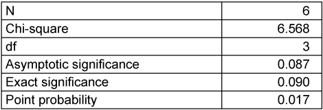 Every unit was assigned a ranking for all the test times. If the measured values did not differ, the assignment of each ranking at every measure time was equally likely for every unit, i.e. the ranking of the units would be distributed randomly over the test times [7]. The zero hypothesis of the Friedmann test indicates that the central tendencies do not differ from each other. The alternative hypothesis, however, indicates that at least two central tendencies differ from each other. The descriptive statistics are presented in Table 3 [Tab. 3], the medium rankings in Table 4 [Tab. 4] and the statistics for the Friedmann test is given in Table 5 [Tab. 5]. Medium values and standard deviations were determined for the individual measure periods. N indicates the number of the chairs. Minimum and maximum designate the minimum and maximum measure values that were considered. The result of the Friedmann test is shown in Table 5 [Tab. 5], line “Exact significance”. No significant differences in the total colony count could be found for the different test times, i.e. the rankings were distributed randomly over the test times. The zero hypothesis is therefore to be maintained.