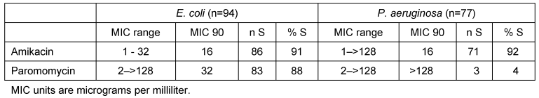 Results: 86 of 94 E. coli isolates (91%) and 71 of 77 P. aeruginosa isolates (92%) showed in vitro susceptibility to amikacin (MIC90 for both compounds: 16 µg/ml, range: 1–32 µg/ml for E. coli and 1–>128 µg/ml for P. aeruginosa). Paromomycin was active against 83/94 E. coli isolates (88%; MIC90: 32 µg/ml, range: 2–>128 µg/ml), but showed poor in vitro activity against P. aeruginosa (3/77 isolates susceptible [4%]; MIC90: >128 µg/ml, range: 2–>128 µg/ml).