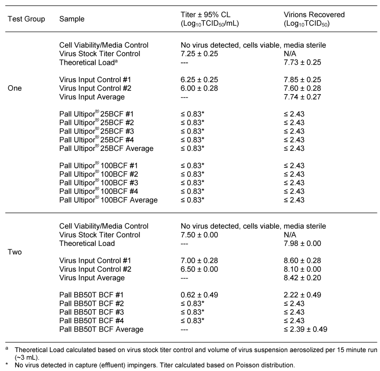 Methods: Laboratory investigation of three filters (PALL Ultipor® 25, Ultipor® 100 and Pall BB50T Breathing Circuit Filter, manufactured by Pall Life Sciences) using a monodispersed aerosol of human influenza A (H1N1) virus in an air stream model with virus particles quantified as cytopathic effects in cultured canine kidney cells (MDCK).