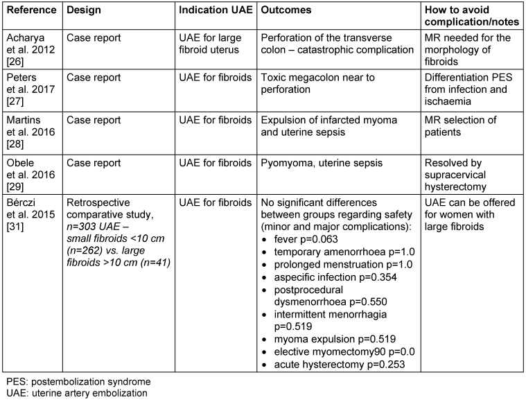 The effectiveness and safety of UAE in the treatment of large and very large fibroids have been debated [2]: we found one retrospective study [25] and four case reports [26], [27], [28], [29] (Table 3 [Tab. 3]) indicating a higher risk of complications such as uterine necrosis and infection, possible leading to sepsis and necessity of hysterectomy, or even life threatening situations due to ischemia of adjacent organs such as toxic megacolon or perforation of transverse colon [26].