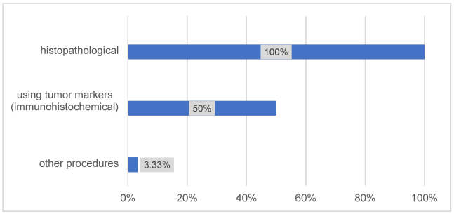 Moreover, PET-CT was routinely performed in 53% of centers. Regarding tumor markers, 50% of the responding centers indicated that they already use additive tumor markers for preoperative tumor staging (Figure 2 [Fig. 2]). In addition, 61% of the responding clinics reported using novel therapeutic approaches that are not described in the current German guideline for OSCC (Figure 3 [Fig. 3]).