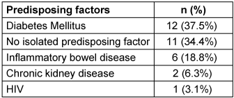 The most common co-morbidities in our cohort were hypertension, obesity (IMC>30), diabetes, and dyslipidemia. Notable comorbidities were the presence of inflammatory bowel disease, chronic kidney disease and HIV (Table 2 [Tab. 2]). The most common predisposing factors were diabetes (n=12), inflammatory bowel disease (n=6), chronic kidney infection (n=2) and HIV (n=1) (Table 3 [Tab. 3]). Eleven patients presented with no known predisposing factor.