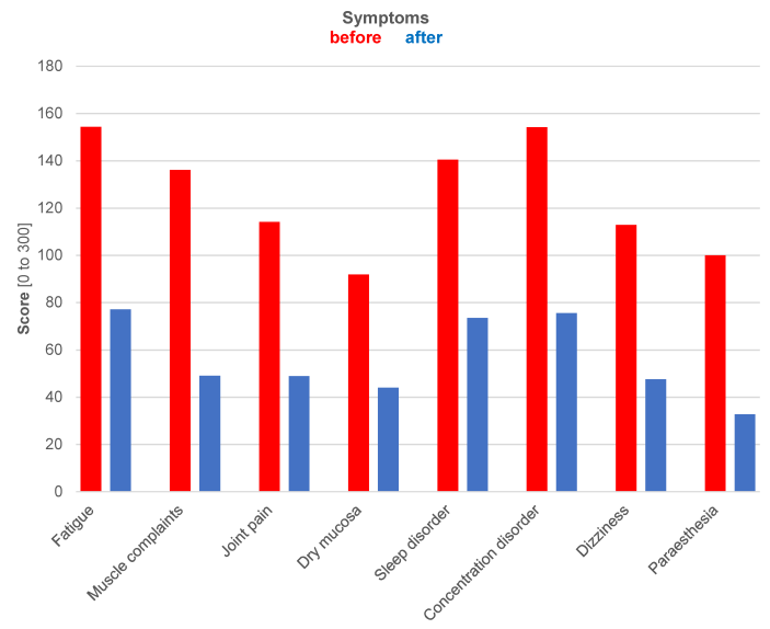 It is noteworthy that there is a clear reduction in the level of complaints, with some symptoms experiencing a decrease of more than half of the previously experienced intensity. However, a complete reduction to zero is not observed for any of the queried symptoms. It is possible that the symptoms may gradually subside over a much longer period than observed in the current collective.