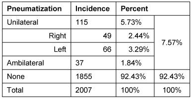 The temporal bones were reviewed for zygomatic air cells in 2,007 patients who were subjected to regular skull computed tomography (CT) at the University Hospital Hamburg-Eppendorf. The period of the studied CT images ranges from 2009 to 2013. CT images of patients that were incomplete or had blurring, had been excluded from the patient population. Patients with a history of maxillofacial trauma or temporal bone pathology were excluded from evaluation as were patients with a known history of skull development alterations.