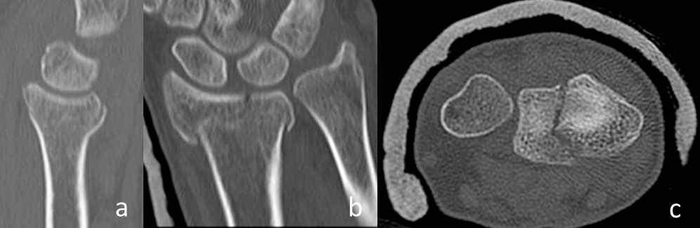Figure 3: a: CT in sagittal plane showing the palmar cortex is not displaced. b: CT in frontal pane showing a sagittal split of the articular surface. c: CT in axial plane showing a sagittal split of the articular surface. Distal radius fracture (AO type C2) with a non-displaced palmar cortex (i.e. no palmar cortex) and no frontal split.