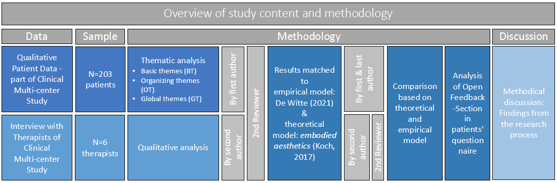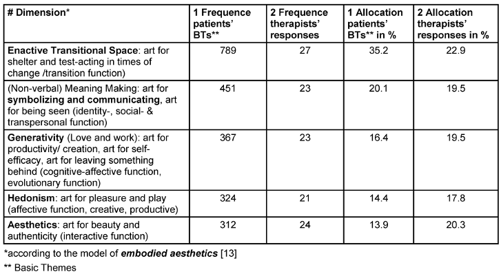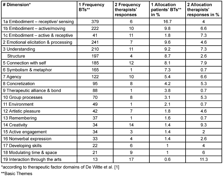 In order to be able to compare the results of the patients’ and therapists’ data of the study, the model of embodied aesthetics according to Koch [13] and the therapeutic factor study by De Witte et al. [1] were used: The 103 BTs (considering the frequency of their codes) and the therapists’ statements were both exploratively assigned to the domains of these two models.