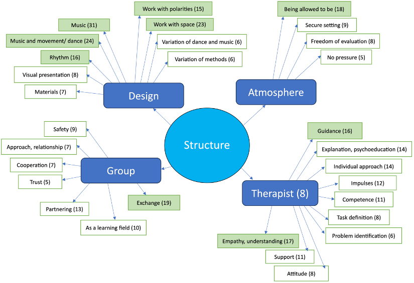 (1) Global theme (GT) Structure: In more than 364 codes – divided into four OTs – the patients described the therapeutic factors that were initiated externally or outside of themselves within the DMT sessions. The Organizing theme (OT) Design (n=136) subsumes the codes that included predetermined creative elements. 31 times the patients named the Basic theme (BT) Music without further context, often as a key point, and 24 times in connection with Movement and/or dance, as in the statement of ETGG19 (ETGG19 represents an anonymized designation of a patient): “By translating music into movement, I had more access to my creativity”. “Through the music, this rhythm, I felt connected to myself and the whole world”, stated the same person as one of 16 examples for the In-Vivo-BT Rhythm. 15 patients’ statements included the Work with polarities (BT), as exemplified in the utterance by PDHG15: “Perceiving extremes in me - through an exercise in which I made extremely fast and extremely slow movements.” The BT Work with space emerged 23 times, for example in ETCE03s description of the realization through a helpful DMT exercise: “How big my own space is around me, namely very small.” The OT Atmosphere was most clearly determined by the BT Being allowed to be with 22 codes. In this BT, the patients described the experience of being allowed to show themselves authentically without having to hold back or pretend, as KEBE24 expresses with the words: "[...] and could be completely myself [...]”. Other BTs regarding Atmosphere (OT) are, for example, a Secure setting with nine codes. In the OT Group, coded 71 times, the BT Exchange dominated with 19 codes - alongside the BT Safety with nine codes, Partnering with 13 codes and the group As a learning field with 10 codes. SGRE21 described Exchange (BT) as follows: “Conversations and exchange with rehabilitants in the group as well as feedback from the therapist” and with this sentence also refers to the last OT Therapist, under the GT Structure with a total of 117 codes. This includes the BT Guidance (n=16) with statements such as from PADG17: "Dance therapist who brought out deeply hidden (“buried”) emotions in me through dance and music. Super!”. The BT Explanation, psychoeducation indicates that the therapist’s explanatory words in the DMT were effective. The BT Individual approach includes responses in which the patients describe how the therapist responds to the individual patients: "Trust in the therapist, who responded to the patients very individually and with a wide variety of methods” (ORFE20); the latter two BTs were coded 14 times each. In addition, the patients’ statements often literally pointed out to the BT Empathy, understanding of the therapist (In-Vivo-Coding) 17 times.
