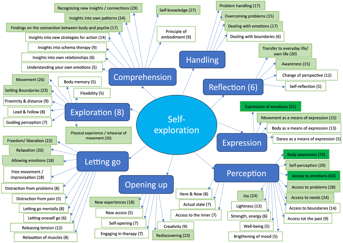(2) GT Self-exploration: The most comprehensive of the three GTs comprises 983 codes – including the three BTs with the highest absolute prevalence – and largely depicts processes that the patients experienced as effective. The OT Expression is about processes of expression with 101 encodings. The Expression of emotions (BT) is reflected in 55 codes, some of which were adopted In-Vivo, as in KEJH10: “Expression of emotions to music and in movement [...]”. Movement, body and dance as a means of expression form three further BTs with five to 15 codes. The above example from KEJH10 also includes Movement as a means of expression (BT). The patients’ articulation of the aspect of Perception (OT, n=314) constitutes the OT with the highest number of codes. This is also due to the fact that the most frequently occurring BT, Body awareness (n=72), and the second strongest BT, Access to emotions (n=63), are subordinate to this OT. HDBE03 combines both in the exemplary answer: "I got to the emotions through my body sensation.”The patients also mentioned nine to 28 times that they had experienced Access to their needs (BT), problems (BT), boundaries (BT) and the past (BT). Several times, statements about this also occurred in combination, as with FREE21: "I was able to determine my personal boundaries and recognize my needs” or, as described in more detail by HDIG07: "I learned to feel into my body, to notice what its needs are and what my emotional needs are [...]”. Patients also described or focused on the Actual state (BT, n=7), the Here & now (BT, n=8) and the undefined inner self (BT: Access to the inner, n=7). The last group of similar BT consists of the perception of moods: Many patients stated the experience of joy (n=24). Lightness (BT, n=13), an increase in Strength/energy (BT), a feeling of Well-being (BT) and a general Improvement in mood (BT) were also coded as individual BTs to be able to convey the effect of positive mood or positive affect in OT Perception more precisely. The OT Opening up with 69 codes includes processes of action that are related to patients opening themselves up to something, opening up to or about Creativity (BT, n=9) or Rediscovering (BT, n=23) something. The BT New experiences, New access, Self-opening and Engaging in therapy with 5 to 18 codes also form it. An example of the coding of the BT Creativity from KEWE23 is: “Creativity – new possibilities to discover access to the subconscious.” Patients listed Relaxation (BT) as a helpful experience 20 times. Feeling free or liberated shows up 22 times in the data as an effective experience. HDDE01 also stated: "I trusted myself a lot more over the course of the therapy and felt like I was liberated.”, which led to the BT Freedom/liberation. Allowing emotions and Free movement/improvisation were coded as BTs 22 times; the latter in statements such as "The free dancing, I was able to let go of everything that was weighing me down." (ENBE13). The OT Letting go abstracts from this and similar descriptions by the patients that the process of letting go (of something) influenced them. Six additional BTs, which describe the outline of Distraction from pain (BT, n=5), from problems or mental and physical letting go, add up to a total of 65 codes. Some patients mentioned the term Movement (BT, n=26) in keywords or its use in various exercises an effective experience: "Release strong emotions through deep breathing in movement." (HTEE23). From the patients’ more explicit explanations, that procedures and processes – which otherwise take place on a different level – could be experienced using the body and/or that they were able to rehearse behavior in this way, the BT Physical experience/rehearsal of movement was developed (n=20). They often mentioned that they practiced Setting boundaries (BT, n=20). The explorative character common to the active processes led to the 103 times coded OT Exploration. HLKG21 wrote about the item after the question of how DMT works: "Impulses led to insights." The following topics or BTs resulted from similarly directed answers from this person and the other patients: Recognizing new insights/ connections (n=29), Insights into own patterns (n=23), Insights into new strategies for action (n=17), Self-knowledge (n=27). "DMT worked because I learned more about the connection between mind and body in different ways." (AEBG01), refers to Findings on the connection between body and psyche (BT), which was coded In-Vivo and led to a 17-fold BT, which, like all BTs under this OT, does not contain any duplicate mentions from the BT New insights/connections. Since the patients reported experiencing new insights in 140 segments, these were brought to the next higher level of abstraction as OT Comprehension. In the TA, the BT Principle of embodiment (n=9) is also shown under this OT. At this point it means learning about the mechanism of embodiment. From the fact that DMT worked for one person participating in the study in such a way that the person was able to "process fears" (KEHE20) and related statements, the systematization for the BT problem handling (n=15) emerged. With the BT Overcoming problems, consisting of 17 mentions of topics such as "handling acute problems" (CALE25), the BT Dealing with emotions (n=17) and the BT Dealing with boundaries (n=6) form the OT Handling (n=55). This OT includes processes of the patients that identify an active and productive confrontation a therapeutic factor of DMT. The OT Reflection (n=52), on the other hand, covers processes in which DMT works by patients integrating what they have experienced into their own thought constructs. This OT was superimposed on the BT Transfer to everyday life/own life (n=20), the BT Awareness (n=15), the BT Change of perspective and Self-reflection. Statements of patients experiencing that certain mechanisms, circumstances and behavioral patterns were effectively transferred from the subconscious to the 