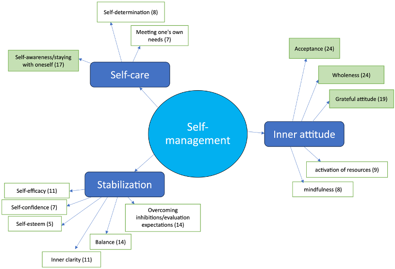 - the self-management of the patients, comprised of therapeutic factors strengthening the inner self-concept, including aspects of stabilization, self-care and inner attitude (Figure 4 [Fig. 4]).
