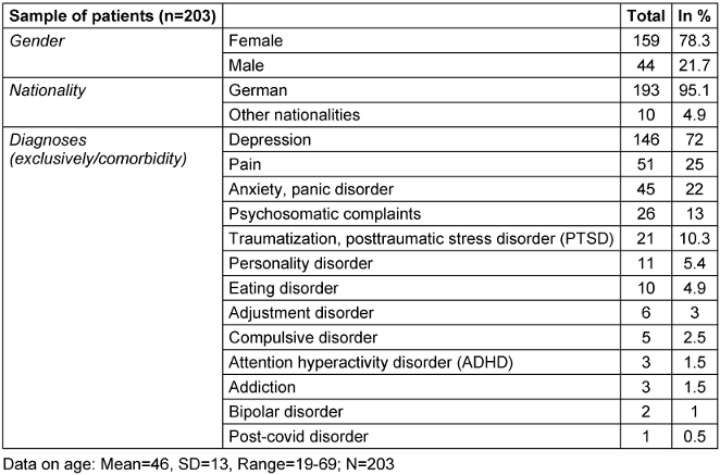 The general conditions of the clinics (range of settings, therapy forms and their orientation) differed, as did the frequency and duration of the DMT units (45 to 120 min). There was also heterogeneity regarding the patients’ diagnoses and, consequently, the specificity of the therapeutic objectives. Accordingly, the therapists adapted their approach and focused on the circumstances and needs of their patients and relied on different approaches and procedures in a process-oriented manner. As a general structure, the sessions consisted of an initial part with a verbal well-being round and/or physical warm-up exercises, a main part with a topic-specific and/or movement-specific focus and a verbal exchange and/or a conclusion in movement (for a tabular overview, see [31]). Examples for concrete content in partner work included hand or foot dialogs, partner-based mirroring in different rhythms and movement qualities, working with the 5 rhythms according to Roth [32] and psychoeducational elements such as introduction of the body-mind-spirit concept [31]). The total samples were composed as follows in Table 1 [Tab. 1] and Table 2 [Tab. 2].