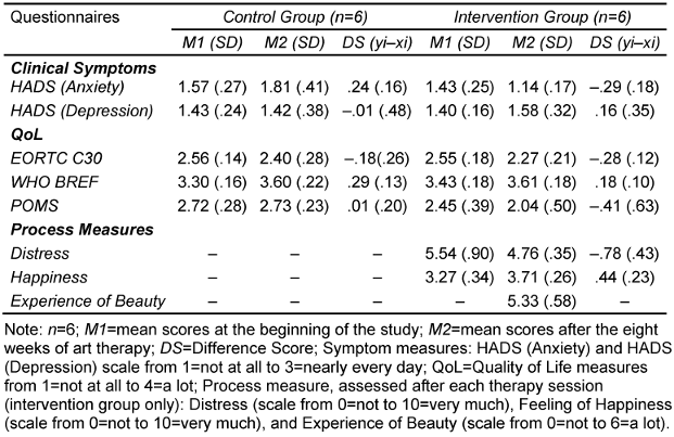 Descriptive values (M, SD, and DS) for the variables of interest in the process measurements are displayed in Table 1 [Tab. 1]. Distress was measured on a scale from 0 (not at all) to 10 (very strong). The feeling of happiness and the experience of beauty were measured on a scale from 0 (not at all) to 6 (a lot). Results suggest that the individuals in the intervention group experienced less distress (DS=–.78) and an increased feeling of happiness (DS=.44) after the art therapy sessions. Furthermore, participants had a higher experience of beauty after the therapy sessions (M=5.33). The mean experience of beauty after the sessions was in the upper range of the scale (M>3) with a stabilization over time, suggested by the mean value of 5 for the last four sessions. Yet, a small N limits the results.