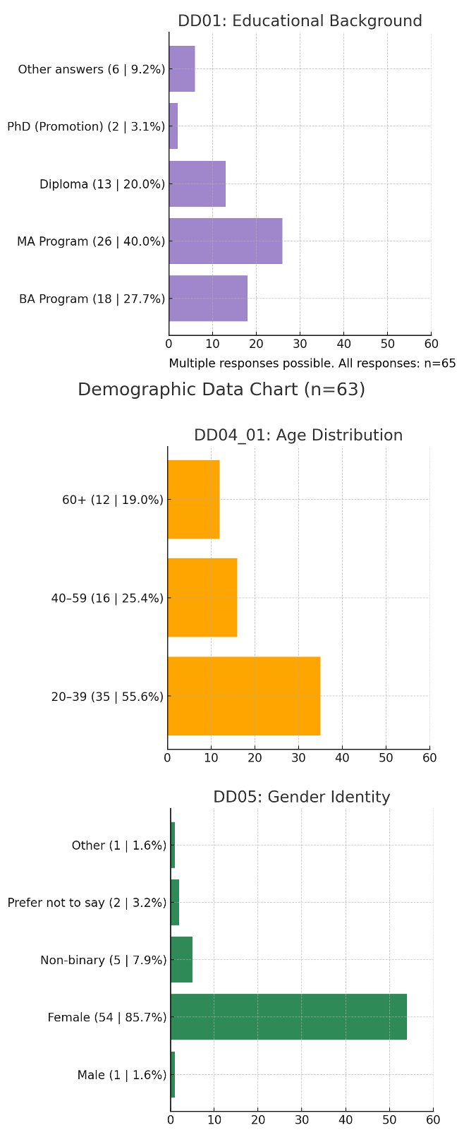 Demographic data show that 85.7% of participants identified as female, 9.5% as non-binary or another gender, 1.6% as male, and 3.2% preferred not to say (DD05). Regarding age, 55.6% were 20–39 years old, 25.4% were 40–59 years old, and 19.0% were 60 years or older at the time of data collection (DD04). Concerning educational background, 40.0% held an MA in art therapy, 27.7% a BA in art therapy, 20.0% had completed a diploma in art therapy, 3.1% held a PhD or equivalent, and 9.2% reported other situations—for example, still studying or holding alternate degrees (DD01; Figure 1 [Fig. 1]).