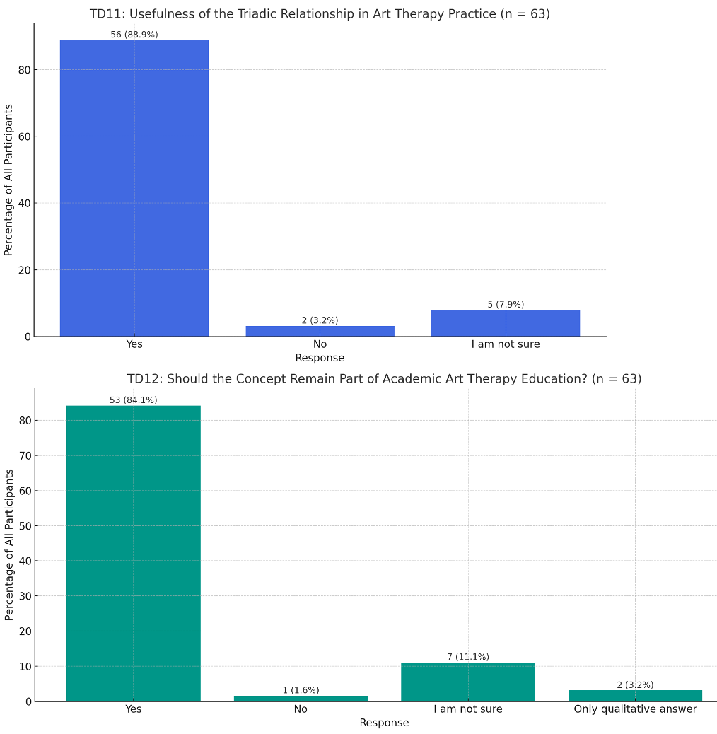When focussing on the topic related data, 88.9% of participating art therapists (TD11) reported that the triangular relationship is useful in their daily practice, and 84.1% (TD12) answered “yes” when asked whether the model should remain part of academic art-therapy education (Figure 2 [Fig. 2]).