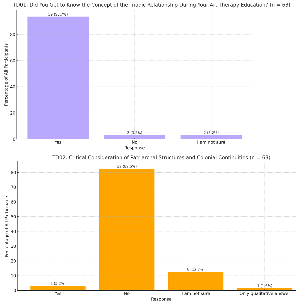 93.7% of participants answered “yes” when asked whether the model of the triangular relationship had been introduced during art-therapy education (TD01). Another question, TD02, inquired if patriarchal structures and colonial continuities were critically discussed in connection with the triangular relationship; 82.5% responded with “no” (Figure 3 [Fig. 3]).