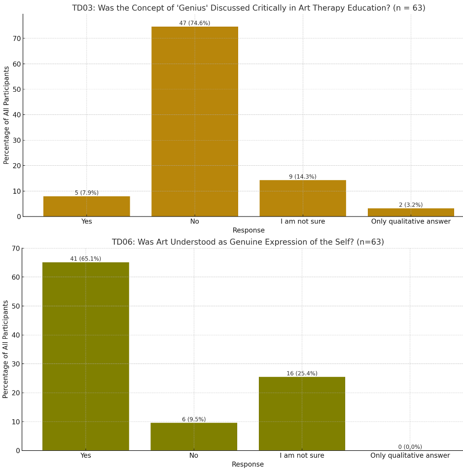 74.6% of survey respondents report that the concept of “genius” was not critiqued in their training (TD03), and 65.1% remember being taught that art can be understood as “genius expression of the self” (TD06). These data could suggest that—despite postmodern critiques—in German art-therapy curricula, modernist narratives about the “genius” persist.