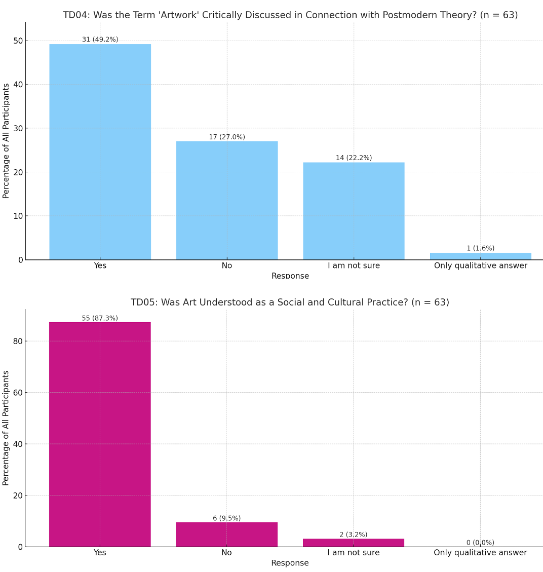 TD04 asked whether art-therapy education had included discussions about what constitutes an artwork in relation to postmodern theory (“Auflösung des Werkbegriffs”); 49.2% answered “yes,” 27.0% answered “no,” and 22.2% were unsure if they had learned about it during their training. TD05 asked whether art was understood as a social and cultural practice arising from an individual’s relationship with the environment; 87.3% of participants answered “yes” (Figure 5 [Fig. 5]).