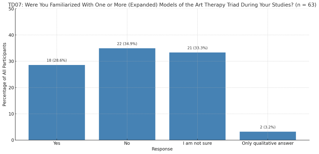 In TD07, participants were asked if they had been introduced to specific models of the triangular relationship during their studies—such as those of Schaverien [2], Bragge and Fenner [4], Schulze-Stampa [5], or Haywood and Grant [6]; 28.6% answered with “yes,” 34.9% answered “no,” and 33.3% could not recall (Figure 6 [Fig. 6]).
