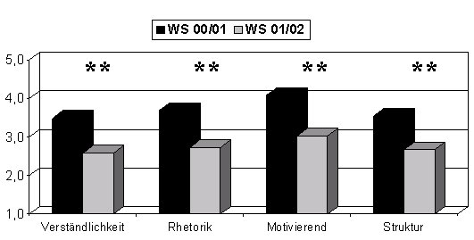 Results: The internal consistency of the questionnaire as well as of its four main components supply evidence for the reliability of the procedure. Validity of content is ensured by the method of construction. The analysis of the four main components of the questionnaire shows construct validity. The assumed bias variables "interest in the subject" and "previous knowledge" did not influence the overall score. The clear improvements of the results indicate the relevance of the evaluation system.