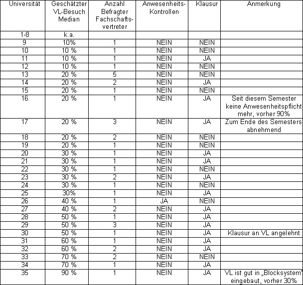 Um zu überprüfen, ob es sich bei schlechtem Besuch chirurgischer Vorlesungen um ein deutschlandweites Problem handelt, wurde bei einem nationalen Fachschaftstreffen im Januar 2004 unter den anwesenden Fachschaftsvertretern des klinischen Studienabschnitts erfragt, wie viel Prozent der Studierenden nach ihrer Einschätzung die chirurgischen Vorlesungen als Lehrangebot an ihrer Universität wahrnehmen. Bei diesem Treffen waren pro Universität 1-5 studentische Vertreter des klinischen Studienabschnittes von 27 deutschen medizinischen Fakultäten anwesend. Die hierbei gewonnenen Daten wurden mit einem standardisierten Fragebogen erhoben. Es wurde eine Skala in Zehn-Prozent-Schritten zur Auswahl vorgegeben. Bei Angaben durch mehrere anwesende Fachschaftsvertreter einer Universität wurde der Mittelwert in Tabelle 2 [Tab. 2] aufgeführt. Zusätzlich wurde nach Anwesenheitspflicht und Abschlussklausuren gefragt.