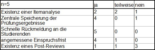 Die Rahmenbedingungen als Voraussetzung für hochwertige Prüfungen sind weitestgehend erfüllt. Ausnahmen bilden dabei die Einsichtnahme in die Prüfungsergebnisse und die Bewertung bei fehlerhaft gestellten Aufgaben, die an allen fünf Standorten fächerintern geregelt werden.