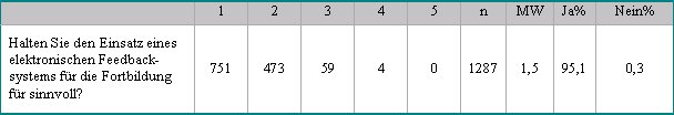 Zusammenfassend lässt sich sagen, dass die Ergebnisse dieser Untersuchung darauf hin deuten, dass sich durch den Einsatz elektronischer Feedback-Systeme eine Qualitätsverbesserung der Lehre erreichen lässt, die auf die Lernerzentrierung des Unterrichts und die erhöhte Motivation aller Teilnehmergruppen zurückzuführen ist.