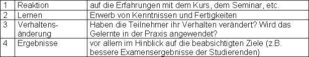 Diese Kategorien sollen ausdrücklich nicht als eine Hierarchie verstanden werden: Eine Evaluation, die sich auf die Reaktionen der Teilnehmer beschränkt, ist bei adäquater methodischer Qualität, nicht grundsätzlich schlechter als eine andere, mit der Verhaltensänderungen oder Ergebnisse festgestellt werden. Diese Aussage mag vielleicht zunächst überraschen, sie ist aber insofern angemessen, als eine empirisch abgesicherte Theorie der „Wirkfaktoren“ von guter Lehre noch weitgehend fehlt. So wäre es durchaus denkbar, dass z.B. eine durch medizindidaktische Fortbildung gesteigerte Motivation der Dozenten, die sich positiv auf das Lernklima in ihren Veranstaltungen auswirkt, auch zu einer größeren Zufriedenheit der Studierenden führt.