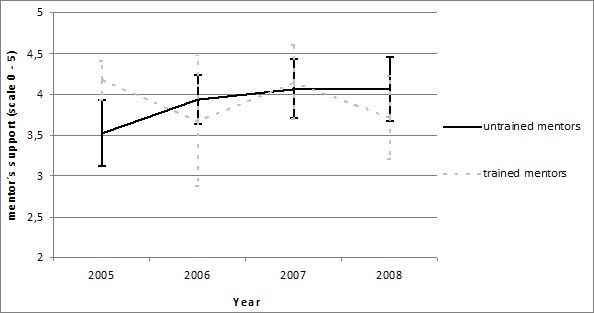 Table 1: Student evaluation of the support from trained and untrained mentors: Support in education was rated between 1 (no, not at all) and 5 (yes, a lot) The educational support experienced by students from trained mentors in 2005 was significantly higher than support from mentors without training. In subsequent years, the ratings of the educational support increased even for mentors without training.