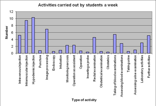 An overview of all activities carries out shows which treatments can most frequently be taken on by students. Students are particularly frequently allowed to carry out injections. In first place are subcutaneous injections with 10.3 per week, closely followed by 9.5 weekly intra-muscular injections. At 7.0 there are imaging activities, taking blood was done 5.5 times per week on average. Students on average injected intravenously 5.2 times per week and carried out rectal palpitation 4.6 times per week. Lab activities and evaluation of blood tests were carried out approximately 3 times per week. Assisting in surgery and monitoring anaesthesia occurs twice weekly for most students. Activities such as evaluating urine tests, intubation, paracentesis, endoscopy, taking urine samples, birth-related examinations, obstetrics and placing tubes were carried out less than once a week. Other activities were listed as being carried out 5.1 times per week (see Figure 5 [Fig. 5]).