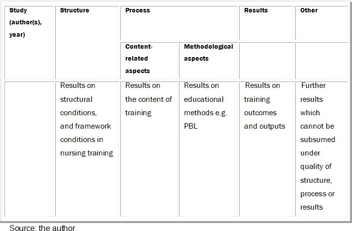 - Structure: here, study findings were included which yielded information about which structures had a beneficial or inhibitory effect on nursing education.