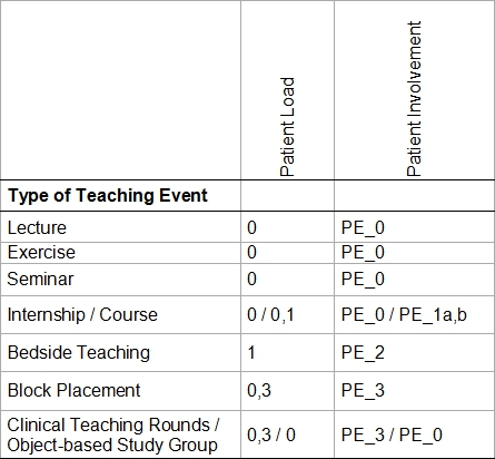A similar grid is likely to be present at all medical schools. For the following considerations it is not important how big the differences between the medical faculties are. The only important aspect is primarily general transferability. The empirical basis for further considerations is the data on lectures collected at the MHH for the current expert evaluation on patient-related capacity calculation in the model degree course HannibaL carried out by Lohfert & Lohfert [14]. This necessarily entails an abstraction of the rich variety of patient-related training in the various subjects at the respective faculties to produce a simple classification. Since the classification places the extent of patient involvement (PE) in the foreground, the various categories are simply numbered in series.