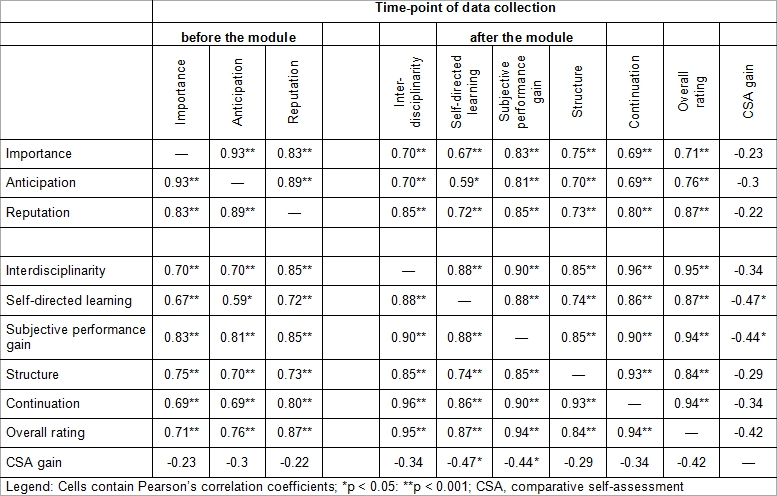 In this study, we observed significant correlations between overall module ratings and student expectations before a module as well as with retrospective ratings of curricular structure and subjective performance gain. Conversely, there was no correlation between CSA gain and student expectations and only a weak correlation between CSA gain and perceived subjective performance gain. Accordingly, module rankings were different depending on them being based on overall ratings or CSA gain values.