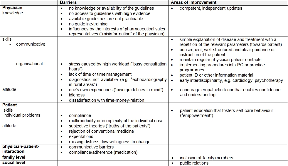 Results: Barriers of guideline adherence were found in the following areas: doctor: procedural knowledge (knowledge gaps), communicative and organisational skills (e.g. time management) and attitude (dissatisfaction with time-money-relation). Patients: individual case-related problems (multimorbidity, psychiatric comorbidity, expectations and beliefs). Doctor and patient: Adherence and barriers of communication. Main measures for improvement of care concerned the areas of the identified barriers of guideline adherence with the focus on application-oriented training of the abovementioned procedural knowledge and skills, but also the supply of tools (like patient information leaflets) and patient education.