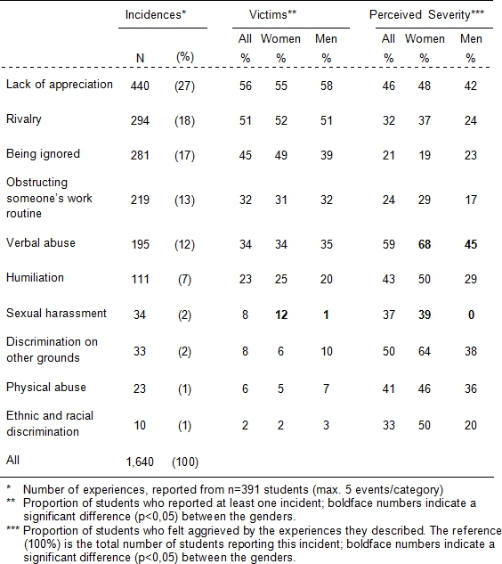 The data were analysed with the program SAS, version 9.2. We were able to switch from „people“ to „events“ as analysis units thanks to the so-called array procedure. This allowed us to compute the absolute and relative frequency of all experiences simultaneously with the number of persons who had had these experiences. A chi-square test provided the significance of the difference between male and female participants. We dichotomised the variables for the degree of aggravation, i.e., students who described themselves as „aggrieved“ or „highly aggrieved“ were considerd „aggrieved“, all others as „not aggrieved“.