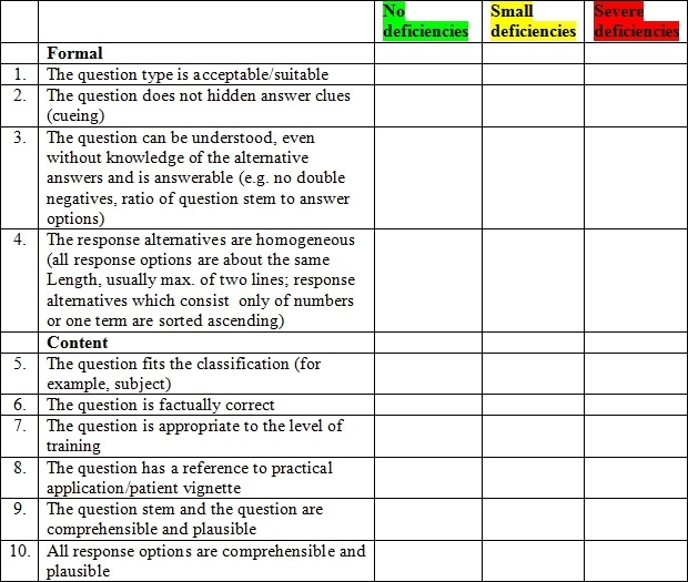 The ten-item checklist against which the MCQs were judged did not reflect all criteria for the creation of “good” MCQs given in the literature [3], [4], [5]. Some items must be considered redundant while other criteria, such as the important question of the relevance of MCQs [11], are missing.