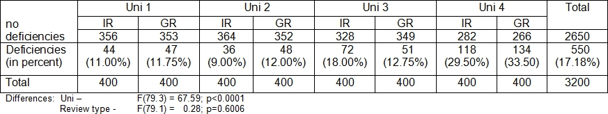 Table 4: Number of separate criteria assessed as deficient of the 4 university sites in individual (IR) and group reviews (GR), including levels of significance
