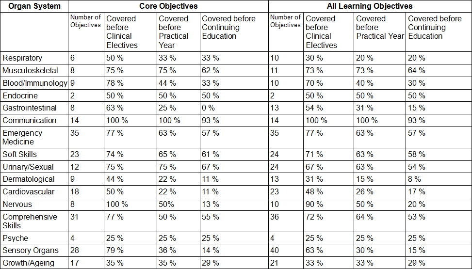 The consensus statement describes 289 learning objectives, 232 of which are defined as core objectives. Each learning objective is assigned to at least one of 16 organ systems. The objective 275 is assigned to the organ system Growth/Ageing and Emergency. This learning objective was recorded twice in this study, and assigned to both “Growth/Ageing” and “Emergency Medicine” organ systems, leading to a total of 290 learning objectives.