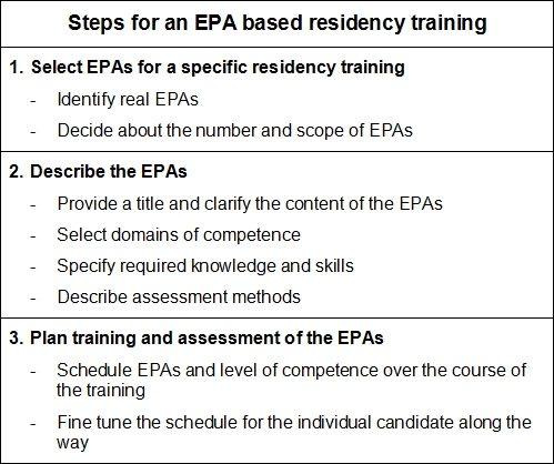 A three-step approach resulting in an EPA-based workplace curriculum for physician assistant training has been proposed by Mulder et al. [21]. This approach can be adapted for residency training in a similar way: