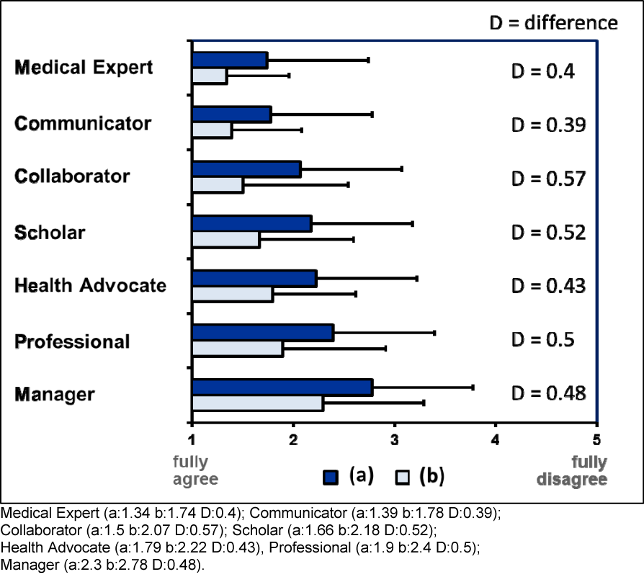 As already said, some of the key competencies were rated to be less important (related to the roles “Medical Expert”, “Manager”, and “Health Advocate”). These competencies address the topics interprofessional communication, basic societal conditions, leadership skills, and preventive medicine. These fields are less central to the individual patient-physician-relationship and therefore might be perceived as less important in the eyes of clinically active physicians. As an interesting point the explicitly interprofessional key competencies (under “Collaborator”) were rated to be more relevant than the key competency “ME3” (Seek appropriate consultation from other health professionals, …) under “Medical Expert”. An explanation may be that the competency “ME3” was rated in comparison to the other key competencies of the “Medical Expert”, while competencies under the “Collaborator” role were clearly limited to collaboration.