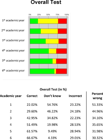 All unanswered MCQs were interpreted as “don’t know” responses due to the standardized instructions provided to all participating students at the beginning of the progress test.