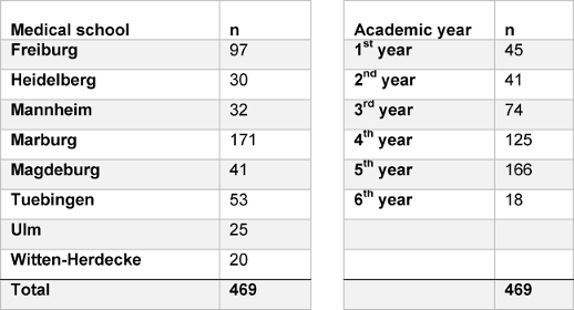 A total of 469 students participated in the pilot study conducted at eight medical schools at the end of November 2013, during which the formative competency-based progress test was administered. The number of students per school or per academic year was subject to great variance (see Table 3 [Tab. 3]).