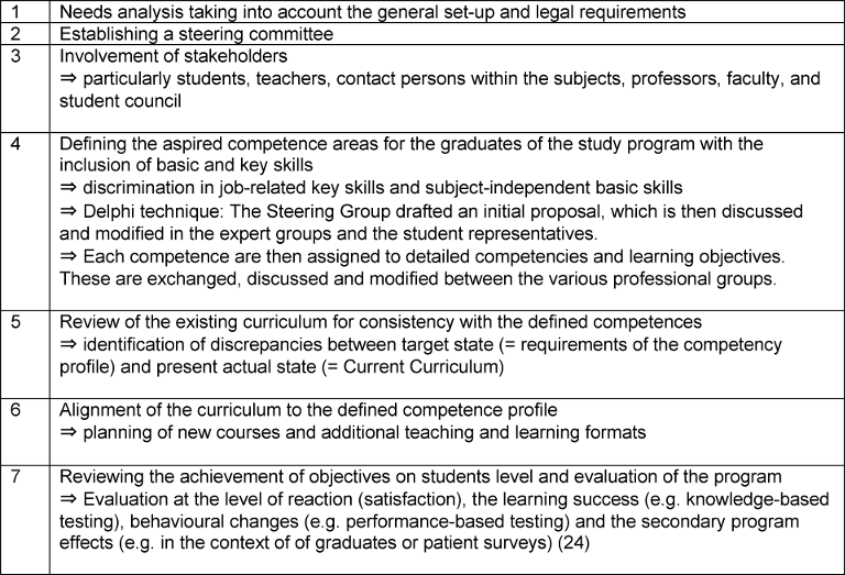 The structuring of curricula today is less input or process-oriented, and more competence-based, e.g. outcome-oriented [18], [19]. The benefits of competence-oriented curricula are that on the one hand they represent a clear control instrument that sets the benchmark of achievement and helps avoid the fragmentation of teaching. Secondly, they facilitate the establishment of individual learning goals and give both students and teachers an outline of the desired result. Two models seem helpful to describe the individual steps in CD: Kern et al. (see Table 1 [Tab. 1]) describes in six steps a method or approach for effective and long-term establishment of a structured educational experience ("planned educational experience" Kern page 1) [13]. This applies both to individual seminars on a particular subject as well as multi-year courses or complete training programs. The individual steps are to run through again and relate to each other.