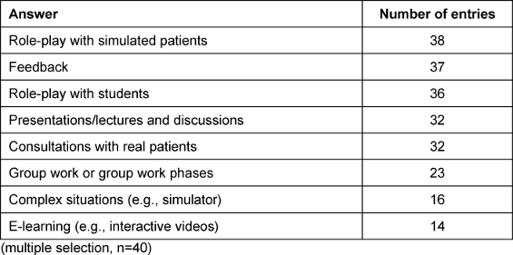 Role-play with simulated patients (SP, n=38) and feedback (n=37) were the most frequently deployed forms of instruction. A detailed breakdown of the implemented teaching methods is available in Table 4 [Tab. 4]. Furthermore, discussions with representatives of self-help groups and video feedback were indicated in the answers to open-ended questions.