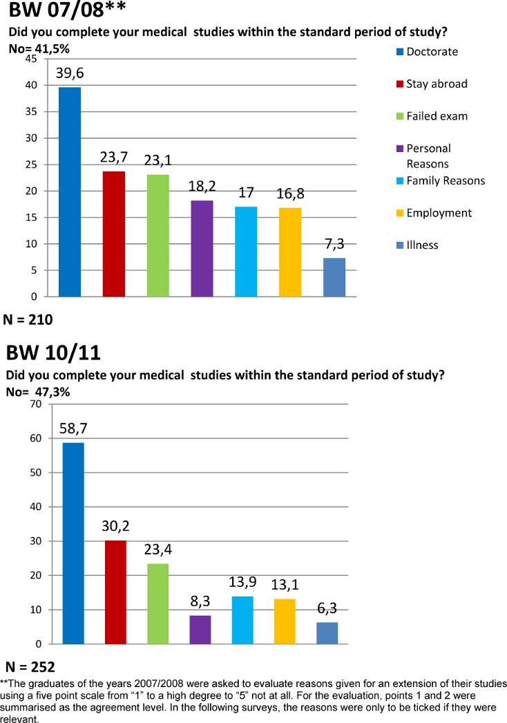 Figure 1 [Fig. 1] shows that 41.5% in 07/08 an 47.3 in 10/11 graduates studied for longer than the standard period of study. The most common reason given for this is the doctorate (39.6% and 58.7% respectively).