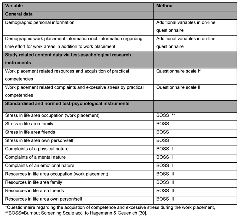 The 137 characteristics recorded in the questionnaire firstly include demographic data and secondly scales that were developed as a research instrument and include work placement related resources and complaints. Burnout Screening Scales were also applied [30], [31]. BOS scales are standardised and normed, have been validated and checked to reflect suitability, resources, stress and psychosomatic complaints with clinical relevance, and were checked with the aid of a German language standardisation sample. The values and parameters included in the investigation as well as the above mentioned instruments with which the same were determined are listed in Figure 1 [Fig. 1] below and are outlined hereafter.