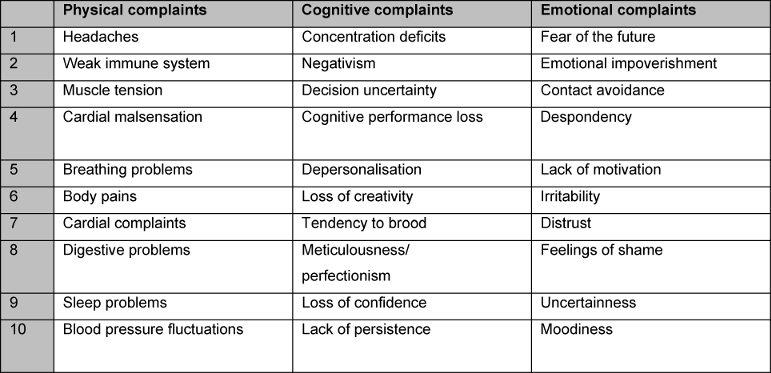 Questionnaire BOSS II includes a total of 30 referral questions regarding clinical symptoms based on three scales of ten items each. It differentiates between levels of physical complaints and symptoms from the cognitive or emotional area.