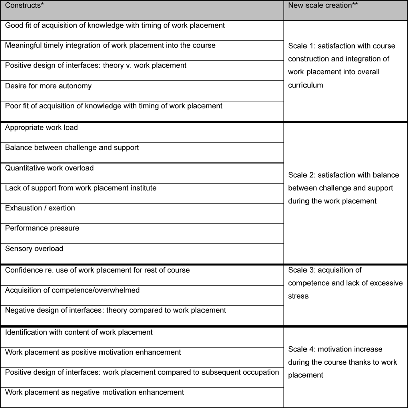Figure 6: Summary of constructs and scale constructions of questionnaire compared with competencies and excessive stress during the work placement*. Constructs are not identical to the two factor: resources or excessive stress **. New scale construction implies a cross-factor content grouping of items.