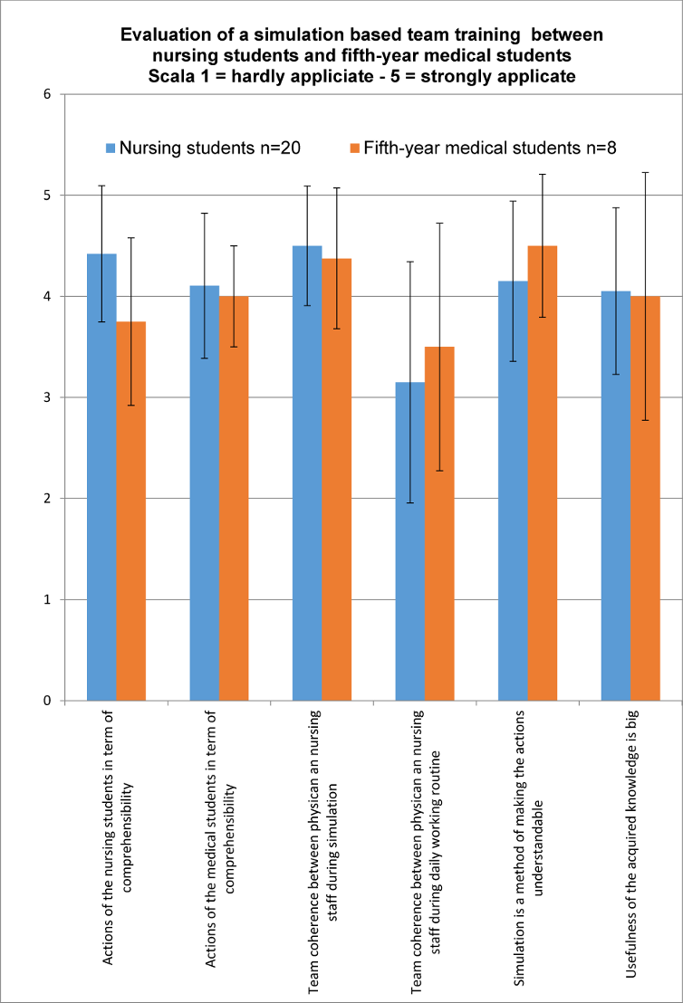 The spoken responses at the end of the teaching sequence gave no indication that immediate changes to the course design were needed. Both days were conducted in an identical manner. The evaluations are presented as the mean value of the five-point scale for all participants with standard deviation (see figure 2 [Fig. 2]). The actions of the nursing students were rated in terms of comprehensibility with 4.4 (±SD 0.67) by the nursing students and by the medical students with 3.75 (±SD 0.83). The fifth-year medical students rated the comprehensibility of their actions with 4.1 (±SD 0.44) and the nursing students rated them very nearly the same with 4 (±SD 0.71). Team coherence between physician and nursing staff was rated with 3.15 (±SD 1.19) by the nursing students and 3.5 (±SD 1.22) by the fifth-year medical students. During the simulation, the results here were 4.5 (±SD 0.59) for the nursing students and 4.38 (±SD 0.69) for the fifth-year medical students. Simulation as a teaching method with the goal of making the actions of the other profession understandable was evaluated by the nursing students with 4.15 (±SD 0.79) and the fifth-year medical students with 4.5 (± SD 1.22). The question about the usefulness of the acquired knowledge in terms of professional practice was rated with 4.05 (SD ±0.82) by the nursing students and with 4.00 (±SD 1.23) by the fifth-year medical students. The questionnaires were not analyzed according to gender due to the small sample size.