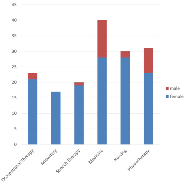 Overall, 220 students were involved in the project comprising medicine (n=41), nursing (n=38), physiotherapy (n=42), occupational therapy (n=34), speech therapy (n=31), and midwifery (n=34) (see figure 1 [Fig. 1]). The medical students were in their ninth semester of study at the start of the project, the hsg students in their third. Although the students had different degrees of theoretical knowledge at this point, both the hsg students and the medical students had gained similar practical experience as the hsg students have a high degree of practical training from the very start of their programs.