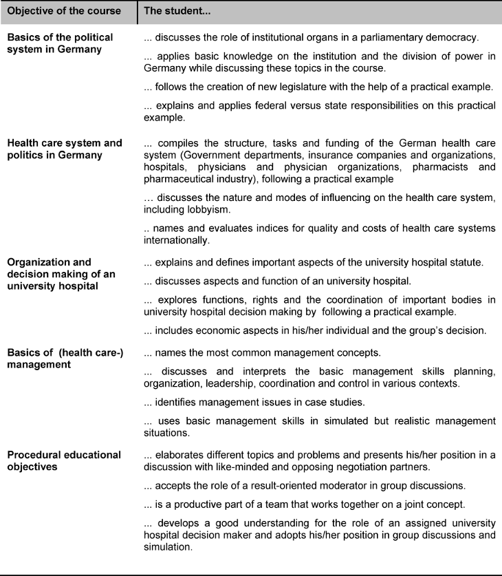 Results: The course undergoes written student evaluation, a round of oral feedback, evaluation of the final projects, and feedback from the hospital’s executive and supervisory boards. All attendees to date have reported a substantial gain in general knowledge and increased knowledge about the healthcare system, and rate the relevance of the course as being high. The majority felt the content was important for their future practice of medicine. Overall, students evaluated the course very positively [overall rating on a six-point grading scale (1=excellent; 6=unsatisfactory): 1.28 (mean)±0.45 (standard deviation)].