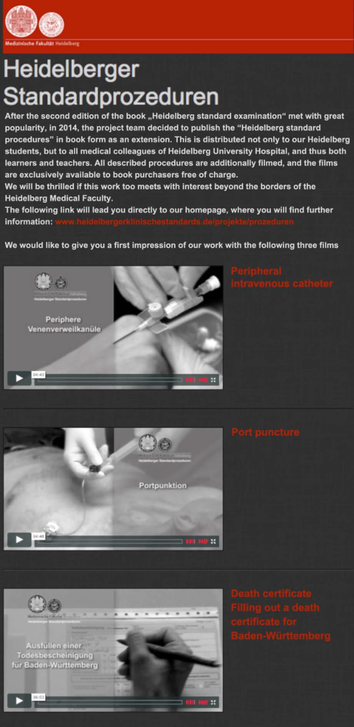 Based on the local resonance and the re-evaluation of the project, the initiative can be deemed a success. The feedback which the project team received through the email addresses provided in the pocketbook is consistently positive. Constructive points of criticism regarding content and suggestions for improvement were gratefully accepted and incorporated in the 2nd edition of the pocketbook “Heidelberg standard examination”. Substantial orders from German and international German-speaking medical faculties, and strong demand for the pocketbook “Heidelberg standard examination” from private individuals also illustrate that the pocketbook and the corresponding film material close a gap in demand. A 2nd, improved edition of the pocket book “Heidelberg standard examination” has since been printed. Currently, the corresponding films are being produced and completed in the accompanying online offer. The pocketbook “Heidelberg standard procedures” went to press in December 2015. The film production for the presented procedures has been completed for this subject area and will be fully available when the book is distributed, and in turn made available to all students and medical lecturers of the University of Heidelberg Medical Faculty. Sample videos can be viewed at http://www.heidelbergerklinischestandards.de/projekte-video/prozeduren/. Further development of contents is planned in the coming years for the areas of complex clinical procedures (e.g. anesthesia induction, conducting ward rounds etc.).